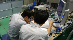 開発業務の様子です。シミュレーションソフトなどを駆使し、独自に設定したテーマに基づいた商品開発、要素技術研究を若手社員中心に行っています。