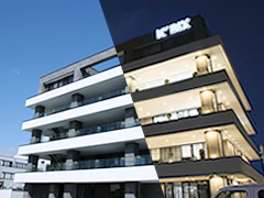 地域のランドマーク的ビルとなることを目指して建設された新社屋。各階のオープンテラスがユニーク。夜になるとひときわ明るい姿が遠くからもわかります。